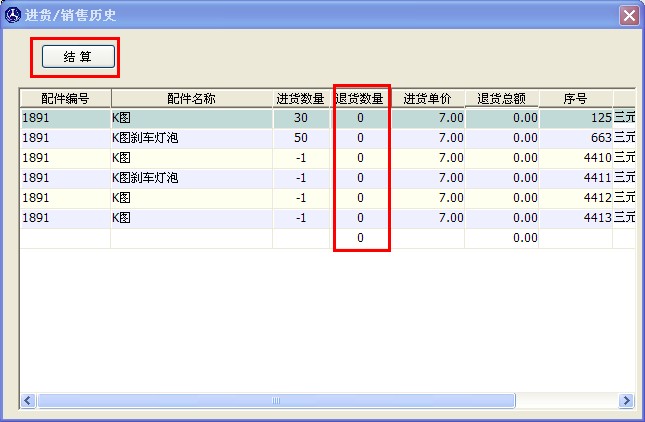 找到要退貨的配件,輸入退貨數(shù)量,再點(diǎn)上方的結(jié)算按鈕即可完成退貨。