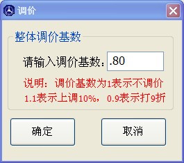 點(diǎn)擊“調(diào)價(jià)”按鈕,可對(duì)所選配件的單價(jià)集體調(diào)價(jià),在調(diào)價(jià)窗口內(nèi)輸入調(diào)價(jià)基數(shù)點(diǎn)確定后會(huì)改變此單所有配件的單價(jià)。
