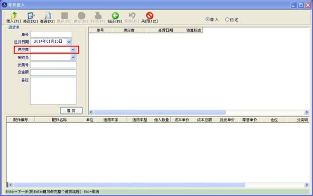配件借入操作與配件入庫操作近似,在供應(yīng)商處輸入商家名稱,點(diǎn)“借貨”按鈕