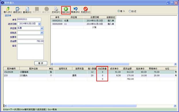 選擇一個(gè)單子后,點(diǎn)擊“歸還”按鈕,可對(duì)此單子上的配件做歸還操作,其操作過程和退貨給供應(yīng)商類似,點(diǎn)“歸還”后,下方的表格將多一“歸還數(shù)量”這么一列,在此列中輸入數(shù)量,再點(diǎn)上面的“保存【F5】”按鈕即可。