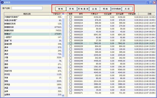 打開應(yīng)收款窗口,如下圖,左邊是商家名稱及欠款合計(jì),當(dāng)您點(diǎn)擊左邊的某條信息時(shí),右邊的表格會(huì)顯示出其應(yīng)付或應(yīng)收的單子列表