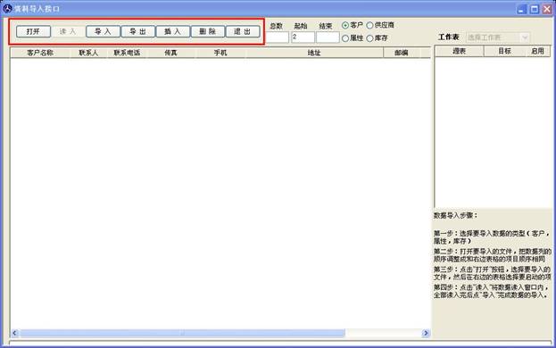 數(shù)據(jù)導(dǎo)入導(dǎo)出可以將您保存在電腦上的excel 文件 導(dǎo)入到軟件里,此窗口支持導(dǎo)入的有客戶資料導(dǎo)入,供應(yīng)商導(dǎo)入,屬性導(dǎo)入和庫存導(dǎo)入,如下圖。四個(gè)類型的導(dǎo)入操作都一樣,現(xiàn)在我們以屬性導(dǎo)入為例進(jìn)行講解。