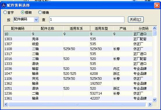 ,可以按配件編碼、配件名稱、適用車名、適用車型、產(chǎn)地、分類碼等等來查詢,選擇一個(gè)您熟練的,新來的貨物里這些資料總會(huì)有其一的,有就能找到它歸屬地。直接輸入后不需要再按什么鍵,如果有就會(huì)直接顯示出來,沒有就不會(huì)顯示出來,例如: